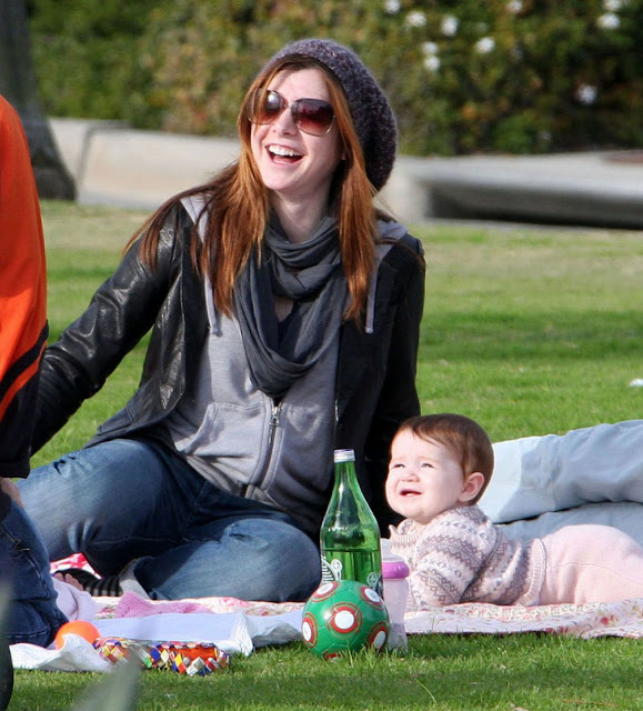 La flamante nueva mamá, Allyson Hannigan (Buffy, the vampire slayer y American Pie) disfruta de un día en el parque con una chaqueta de cuero.