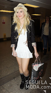Pixie Lott con un mini white dress, sombrero y botitas de media caña con tachas. Antes del Fashion Week, esta chica luce botitas beige de ante, con chupines de cuero. Lleva una chaqueta y una campera en marrón. Sin accesorios y con mucho labial colorado, un look para copiar.