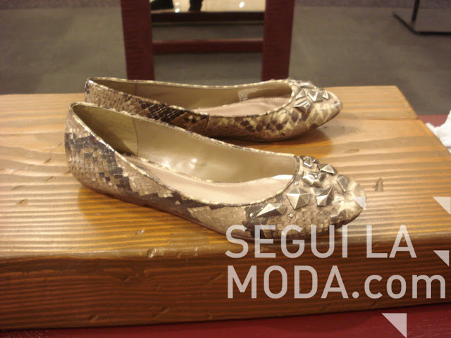 En piel de serpiente, y con tachas de distintas shapes en la punta, estas chatitas están en uno de los Department Store principales de Miami.
