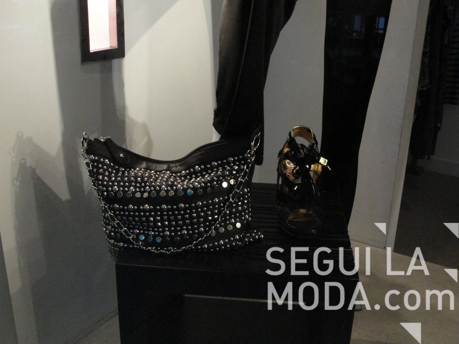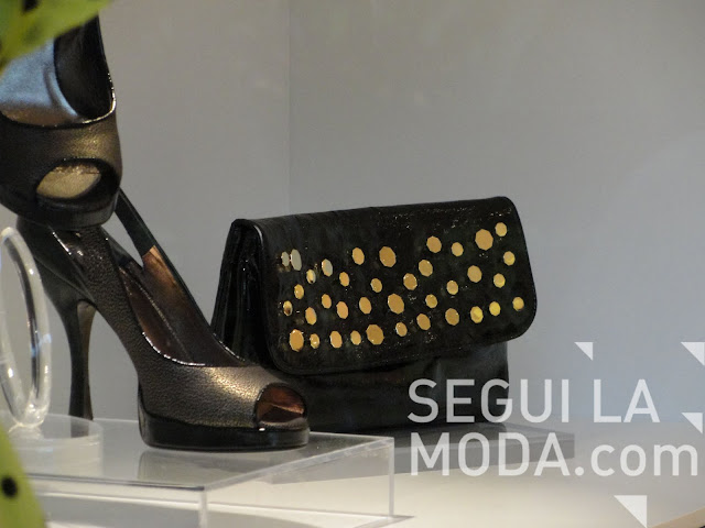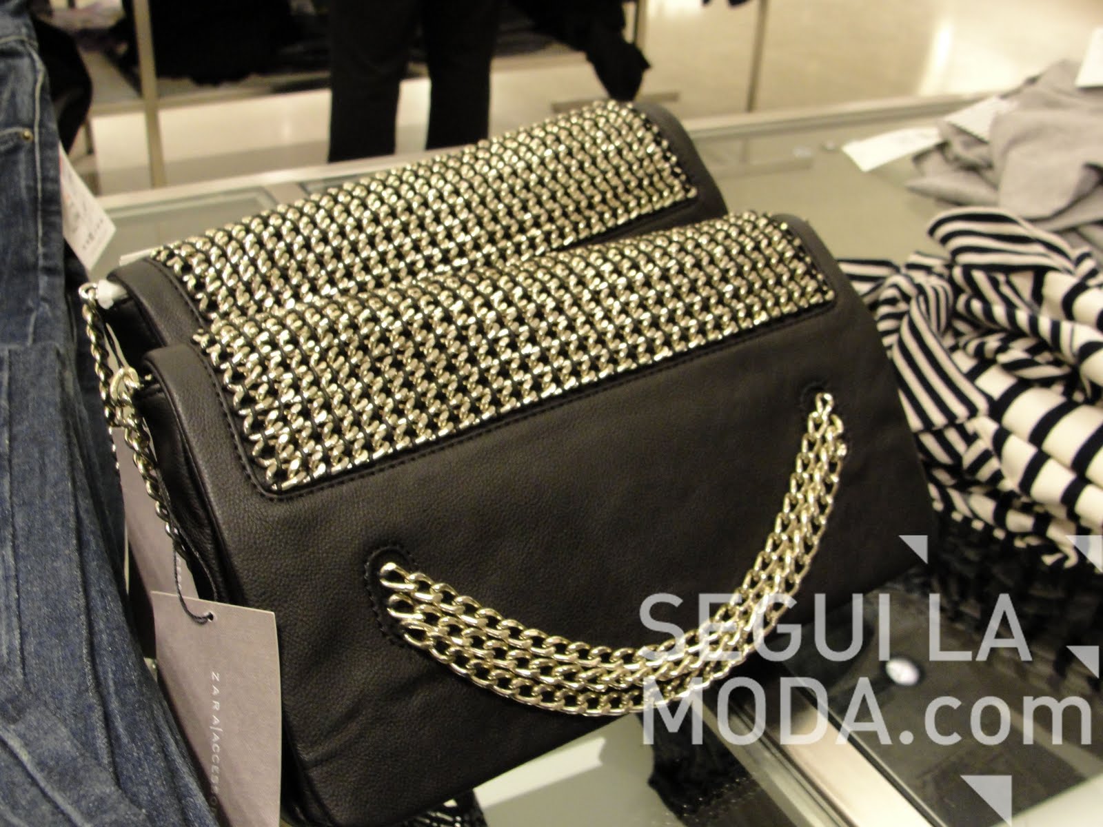 En Bal Harbour, la vidriera de Vera tiene esta cartera, también con espejitos y pequeñas tachas. La majija de cadena también, con una cinta de cuero que la crusa.