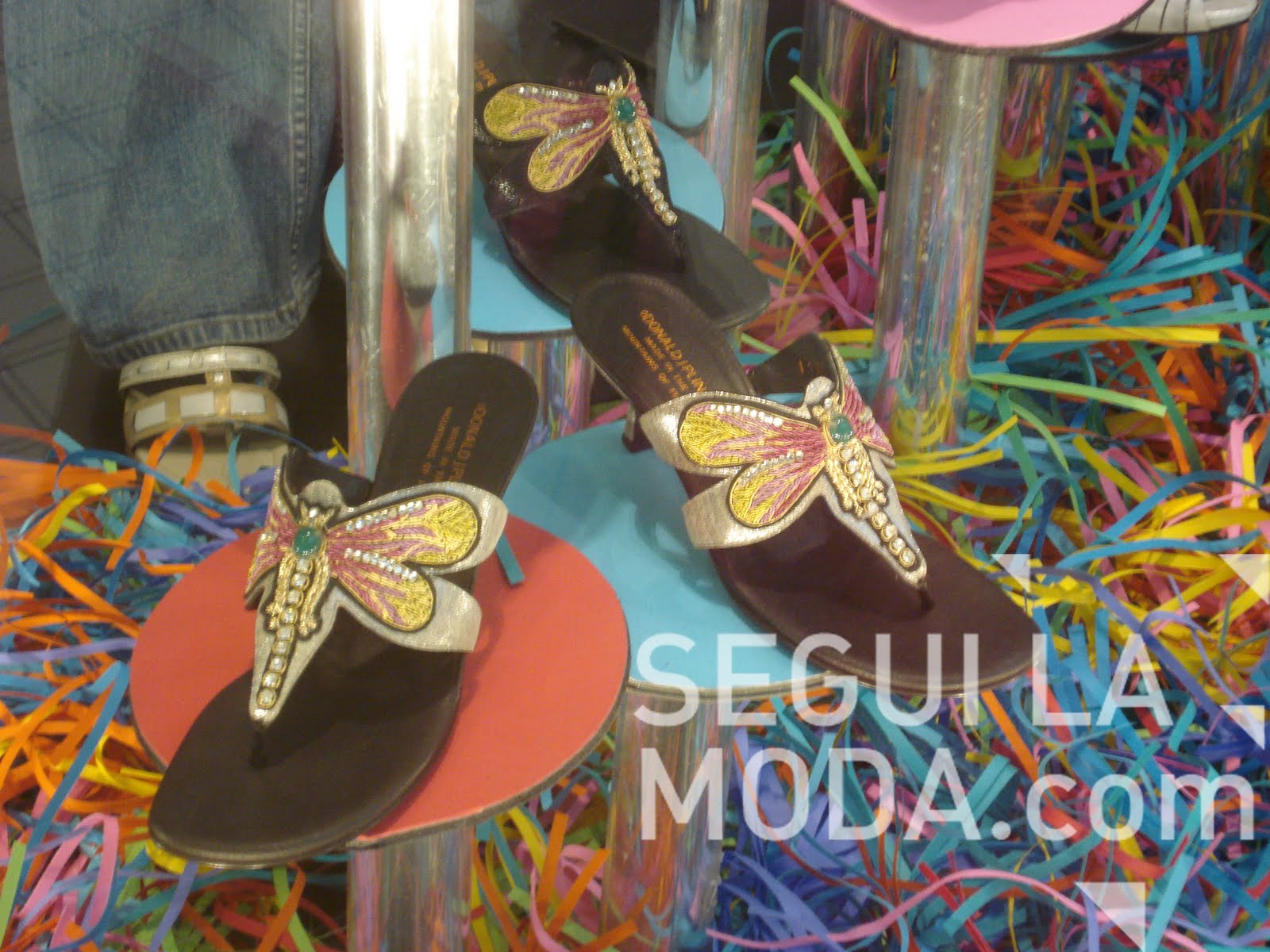 Los locales del Aventura Mall, no se quedan afuera de los must have. Sandalias con taco y una mariposa bordada, y pintada, con apliques de brillantes.