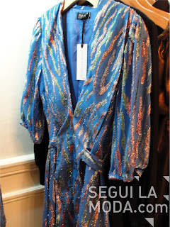Agustina Valenzuela Linage muestra a una clienta el vestido negro con ribetes dorados, un must para esta temporada bien setentosa.