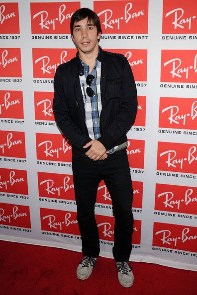 Justin Long con los Ray Ban colgados de su camisa a cuadros.