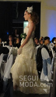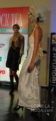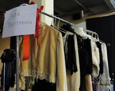 El tercer desfile fue el de Catalina Rautemberg, que comenzó con música bien tanguera, y haciéndole honores, mucho negro, encaje, seda en color crudo, exagerados (y bien Bradhsaw) tocados en la cabeza, y un vestido blanco de novia que llevaba en los pies zapatos negros.