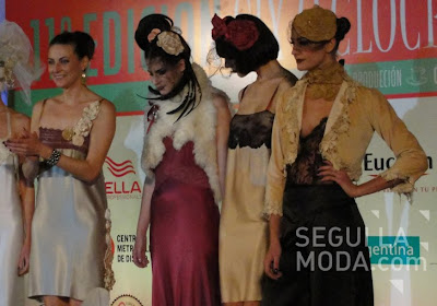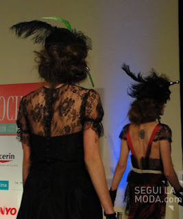 Pia Carregal también eligió plumas para los tocados en la cabeza. El bordeau como color principal, con detalles de negro. Los géneros: seda y encaje.