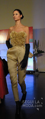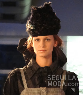 El tercer desfile fue el de Catalina Rautemberg, que comenzó con música bien tanguera, y haciéndole honores, mucho negro, encaje, seda en color crudo, exagerados (y bien Bradhsaw) tocados en la cabeza, y un vestido blanco de novia que llevaba en los pies zapatos negros.