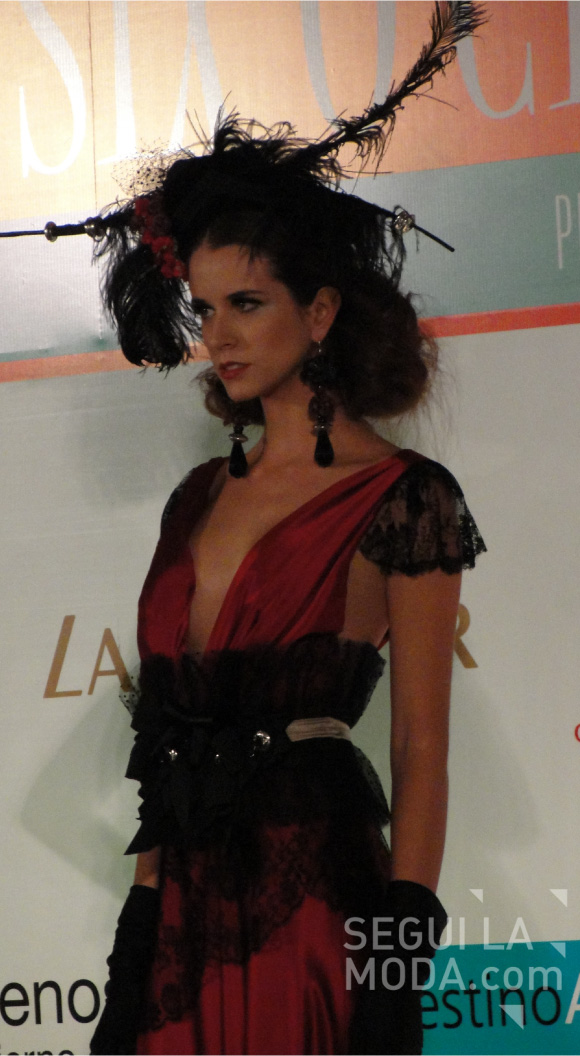 Pia Carregal también eligió plumas para los tocados en la cabeza. El bordeau como color principal, con detalles de negro. Los géneros: seda y encaje.