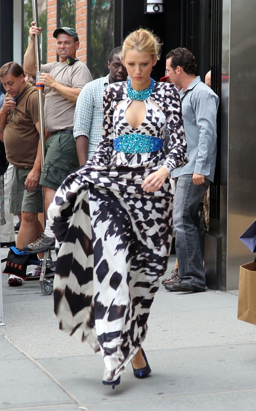 Largo vestido estampadode Jenny Packham y zapatos de Raphael Young para la blonda en su personaje de ficción, y shorts con calzado de Louboutin para Blake Lively, detrás de escena.