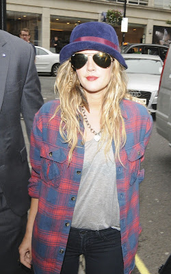 Boyfriend shirt a cuadros, chupines negros de J Brand y zapatillas a tono que rockea con un gorro de capelina corta en terciopelo violeta. El look de Drew en la puerta de Radio 1, BBC, se completa con gafas aviator de Ray Ban.