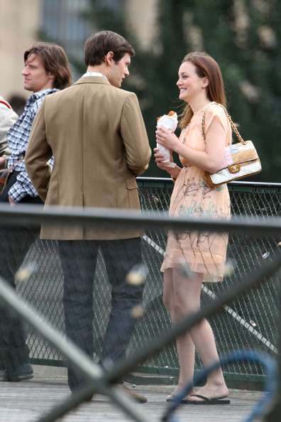 Todavía en Paris, grabando Gossip Girl, Leighton Meester con un vestido de Sariah y carterita de Chanel, o con un Oscar de la Renta que acompañó de clutch fucsia shocking de Roger Vivier.