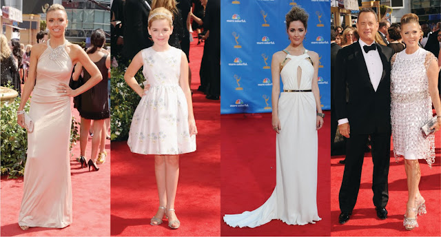 Too white. Giuliana Rancic con un ajustadísimo vestido halter con detalles de pedrería en el escote, la niña Kiernan Shipka (¿la next Dakota?) también de blanco, la actriz Rose Byrne con un largo vestido blanco con cinturón dorado y Rita Wilson, junto a Tom Hanks, con un vestido de Prada y zapatos de la misma colección.
