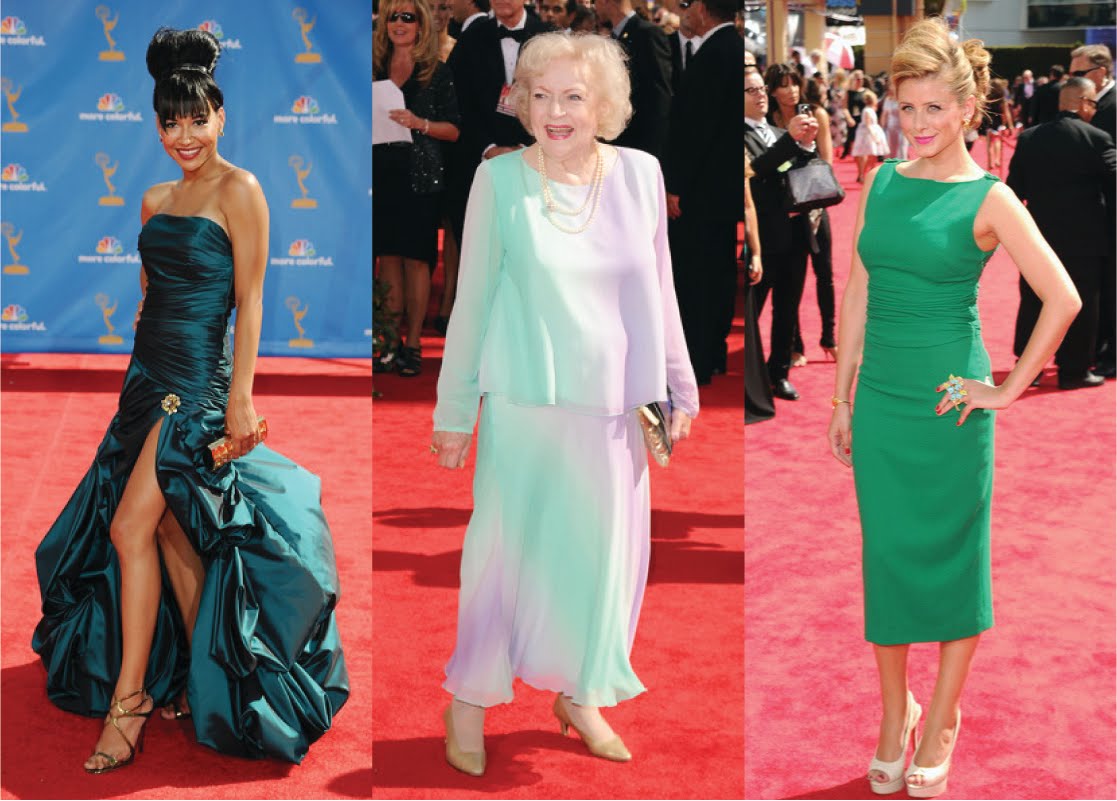 Verde! Naya Rivera con un exageradísimo peinado, altísimo tajo y un sandalias doradas, no estaría en una lista de las mejores vestidas, aunque el tono verde está perfecto para la ocasión. Con un amplio vestido de dos piezas, Betty White se ve monísima! De base en blanco, con verde y violeta, la actriz completó el look con zapatos de taco medio y un collar de perlas. Adorable! Look sesentoso, Lauren Bosworth con un vestido verde de Karen Caldwell y peinado de volúmen.