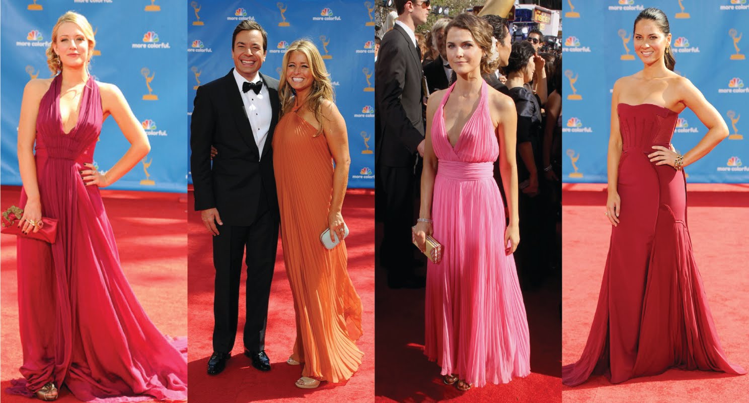 Fruit punch. De colorado, Kristen Quintrall, escotadísimo vestido para la rubia, junto al presentador de la noche Jimmy Fallon, la productora Nancy Juvonen eligió una túnica anaranjada con plisados, y un clutch plateado. La protagonista de una serie favorita de muchos, Felicity, Keri Russell, eligió un rosado vestido Vintage Scherrer (Decades) que combinó con zapatos de Jimmy Choo, clutch de Leiber y joyas de Cathy Waterman.