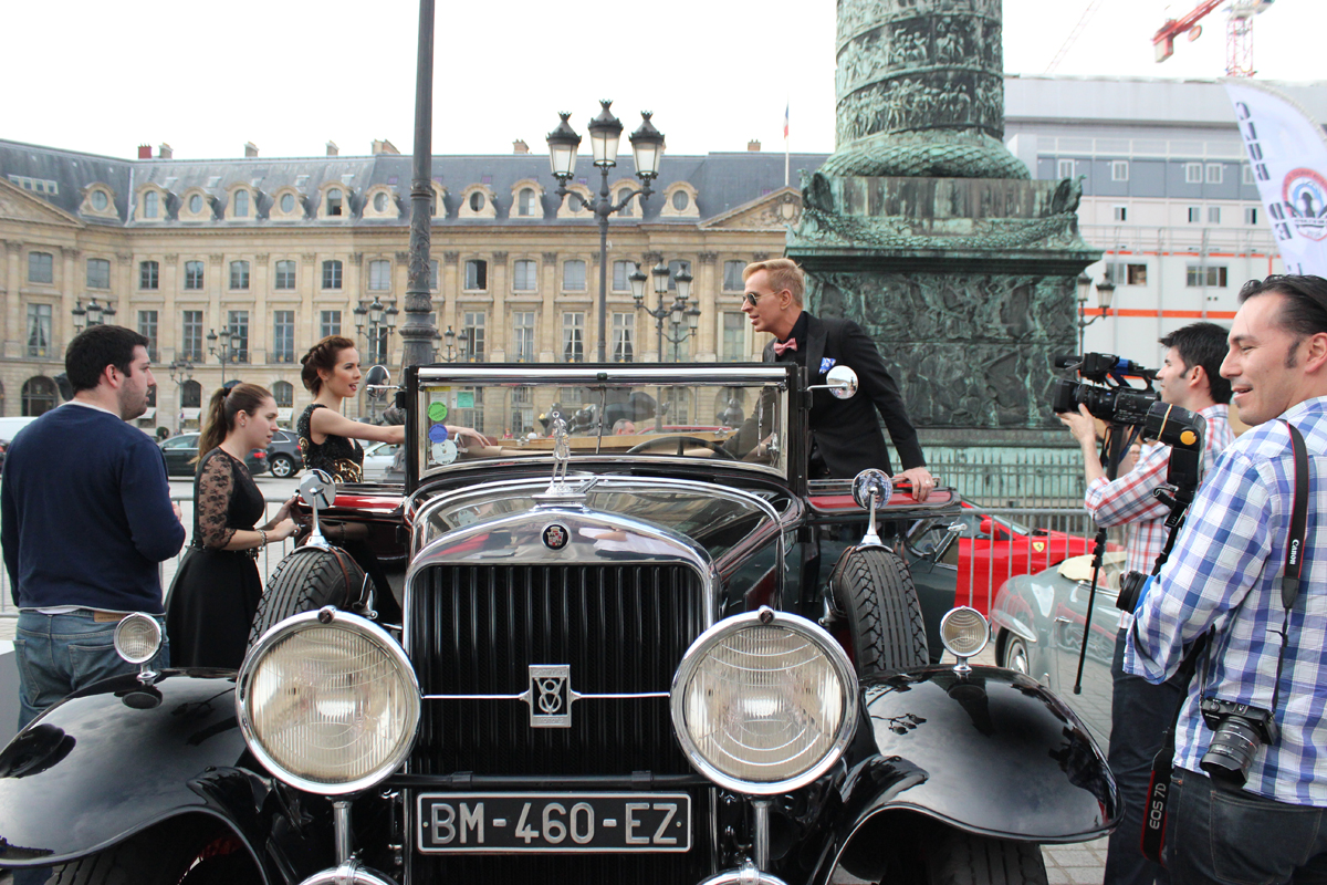 Jorge Ibañez con Elina Fernandez posan con un auto antiguo en Paris