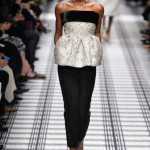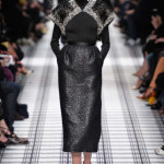 Con el pelo recogido bien tirante, las modelos llevaron las propuestas pensadas por Alexander Wang para la maison. El show comenzó con Lady Gaga que caminó por la pasarela mientras la perseguían dos fotógrafos. La silueta sigue la línea de la marca, con terminaciones redondeadas en hombros o caderas. En un intento de modernizar la tradicional casa de Cristóbal, Wang se juega por una propuesta de contrastes: top peplum sobre pantalón, falda de tiro alto con sweater, vestido strapless con borde de piel o un tapadito en bordó con bolsillos celestes.