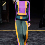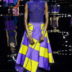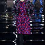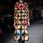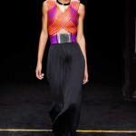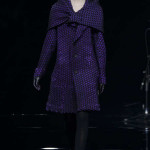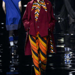 La colección se llama Colorscope y se traduce en estampas psicodélicas, colores vibrantes y contrastes inesperados. Un tapado irregular bordó sobre un pantalón de rayas diagonales anaranjadas, un vestido violeta y azul, tapados por la cintura en azul eléctrico. Todo con las construcciones que Yoshiyuki Miyamae suele hacer, de amplios volúmenes.