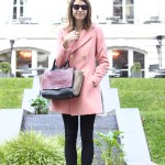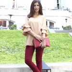 Para el look pensé en un pantalón de color azul de H&M, con una camisa a lunares de Zara y una cartera de Betsey Johnson que tiene moñitos y lunares. Llevé también un sweater negro de Jazmin Chebar porque soy muy friolenta, y un tapado crudo de Uma. En mis pies unas ballerinas de Tommy Hilfiger. El cinto trenzado es de Wanama, las gafas de Infinit, el reloj dorado de Marc by Marc Jacobs, y el collar de H&M.